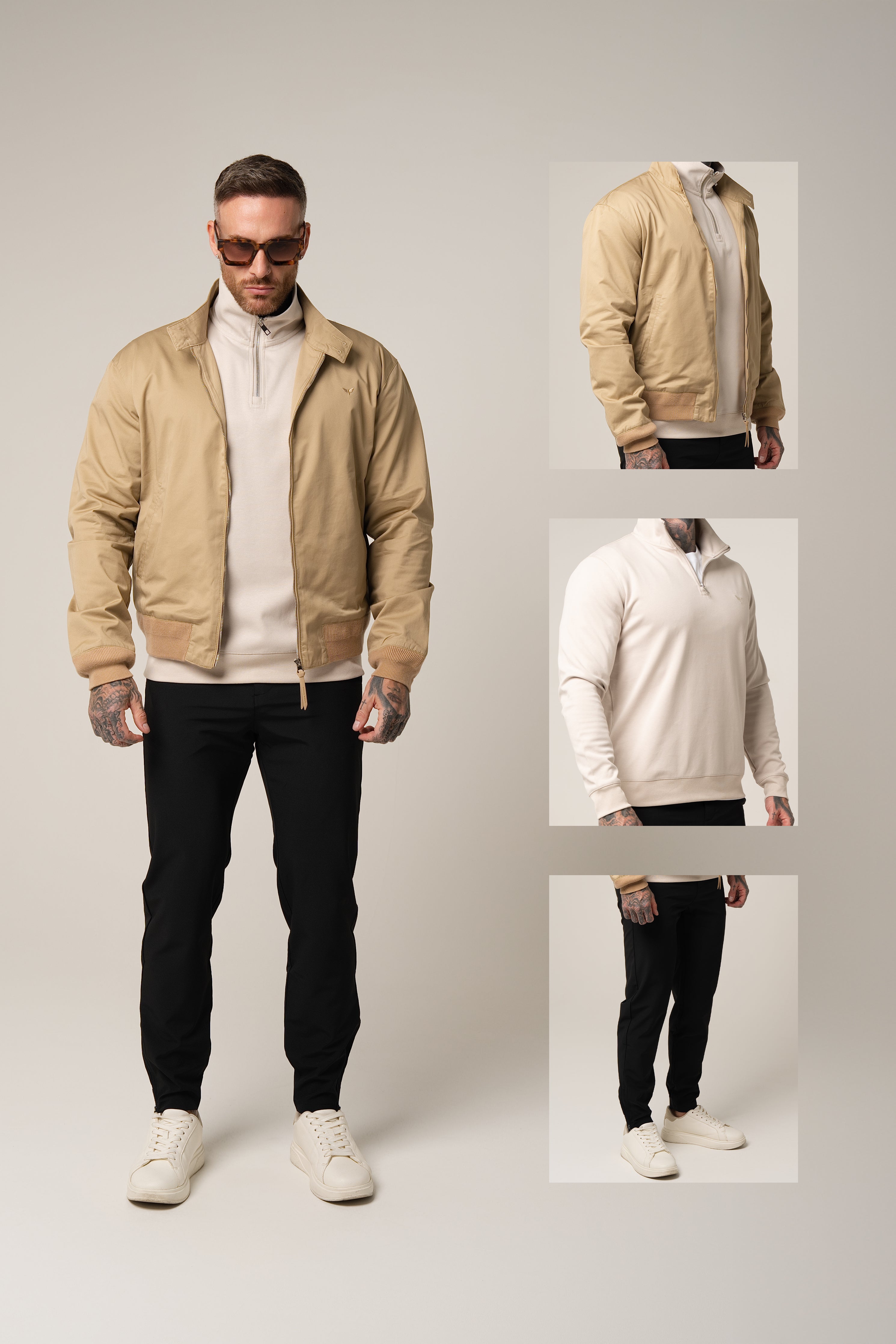 1x Alessio Quarter-Zip | Sabbia Toscana Die Isolierung. Darunter getragen, sorgt die Alessio für einen nahtlosen Übergang. Der hohe Kragen des Quarter-Zips schmiegt sich perfekt an den Halsausschnitt der Bomberjacke an und schützt so vor Kälte, während er dem Gesicht eine strukturierte, rahmende Optik verleiht.